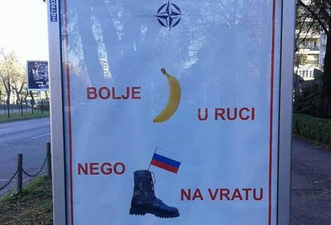 У Подгорици се појавио билборд са логом НАТО-а и поруком која гласи „Боље банана у руци него руска чизма за вратом„, коју потписују „црногорске патриоте„.