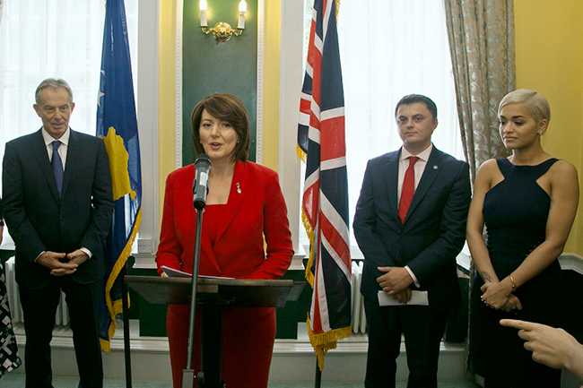 - ФАКТИ: Обавестила је британску краљицу да је Косово држава која „доприноси сигурности и миру, не само у региону Балкана“. Претходно је у центру Лондона у тзв. амбасади Републике Косово, којом руководи лорд Џонсон као амбасадор, рекла присутном саветнику Александра Вучића, Тонију Блеру: „Господине Блер, хвала Вам што сте нам помогли да изградимо државу Косово“. Овоме је присуствовала и певачица Рита Ора као нови почасни амбасадор „Републике Косово“. Погледајте и ове видео-кадрове - да не бисте имали илузија о онима који воде Србију!