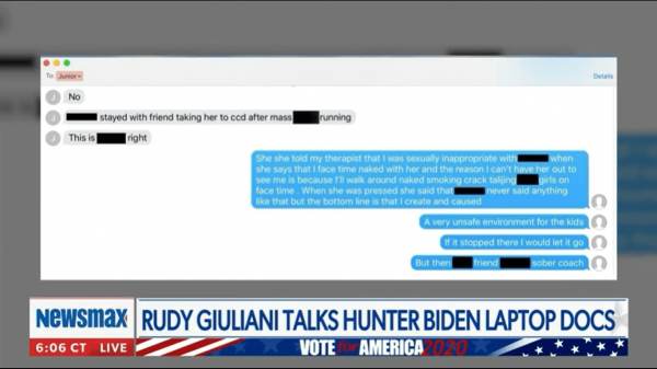 * Правни саветник Доналда Трампа – бивши градоначелник Њујорка Рудолф Ђулијани – обелоданио поруку коју је Хантер написао оцу након што га је Хале Бајден (удовица његовог брата) оптужила за непримерено понашање са малолетницама. Замерила му је што је го преко Facetime разговарао на са 14-годишњакињом