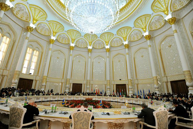 У декларацији усвојеној у Душанбеу указује се да је ШОС за јачање централне координирајуће улоге УН у међународним односима.