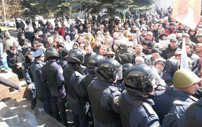 „Штаб самоодбране Југоистока обраћа се становницима наших области. Прошле ноћи су похапшени наши активисти. Хапшења и претреси се настављају. Милиција нас издаје. Ја сам Валериј Дмитријевич и предводио друштвену организацију Савез ветерана ваздушно-десантних снага Луганске области. Лично сам учествовао у прикупљању помоћи борцима Беркута и војницима унутрашње војске (жандармерије). Надам се да су у Министарству унутрашњих послова остали људи од части који ће кренути са својим народом. Позивам народ Југоистока да започне отворени отпор. Све што је било планирано за 6. април – мора бити остварено. Ми не смемо одступити, ово је наша земља”.