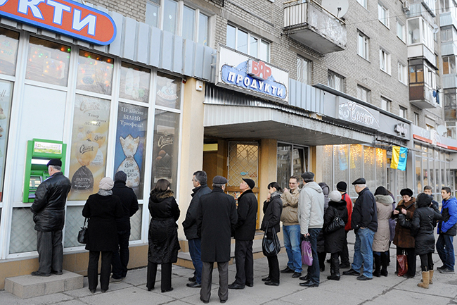 Курс гривне према долару - после пада на 40 гривни за $ - Национална банка одржава са огромном муком, а и то само у очекивању кредита ММФ. Међутим, та политика је (заједно са девизном паником) већ довела до обуставе увоза и до брзог осиромашивања избора робе у продавницама.
