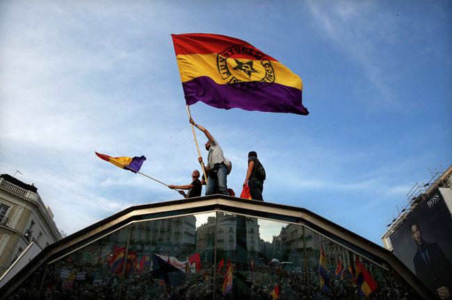 Демонстранти су махали заставама Друге Шпанске републике са црвеним, жутим и љубичастим пољима и скандирали „Шпанија ће сутра бити република!“.