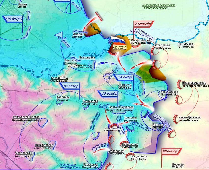 * Руска пешадија је ушла у Северск из неколико праваца — са југа, југоистока и североистока. Под њеним налетом, Украјинци су последњих дана своје главне одбрамбене линије извукли изван града, па је руска пешадија фактички била неометана у градским борбама