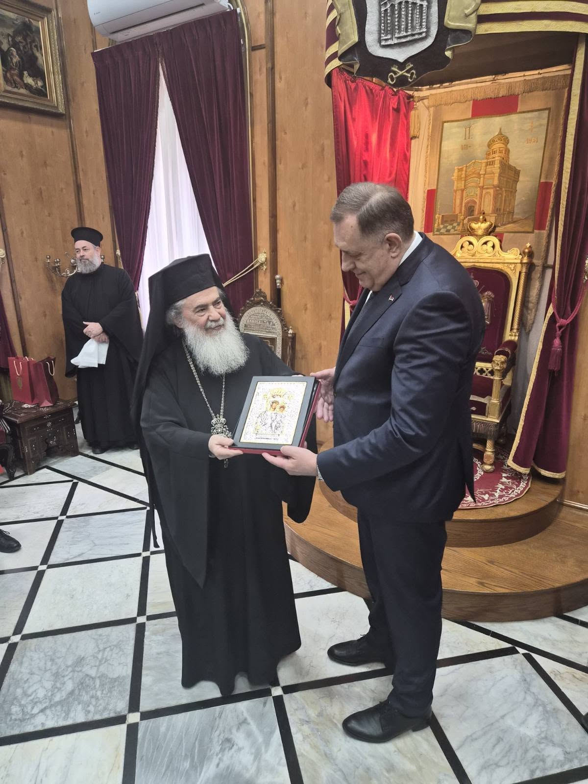 - Разговарали смо о односима Српске и јерусалимске патријаршије и о развоју глобалних односа. Било је интересантно слушати патријарха и његово поимање и оцјене о развоју глобалних процеса, као његово снажно залагање за јачање идентитета и личног и заједничког. То је нешто што је део традиције и културе. Ову част доживљавам као израз дубоког поштовања према српском народу и Републици Српској - поручио је Додик.