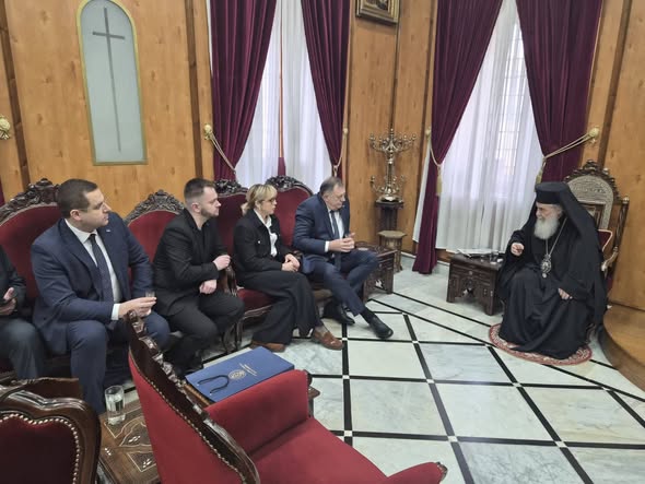 * Милорад ДОДИК: На Савиндан, Дан Светог Саве, посебан је благослов имати сусрет с Његовим блаженством, патријархом јерусалимским Теофилом Трећим. Везе српског народа са Светом земљом трају вековима - још од времена Светог Саве, чија је духовна и државотворна мисија била надахнута управо овим светим местима. Данашњи разговор био је сусрет вере, историје и пријатељства које повезује српски народ и Јерусалим