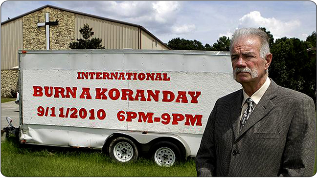 Учинио је то у граду Хејнсвил на Флориди - у присуству двадесетак људи. При том је апеловао да буде ослобођен хришћански свештеник Јусеф Надархани који је у Ираку осуђен на смрт.