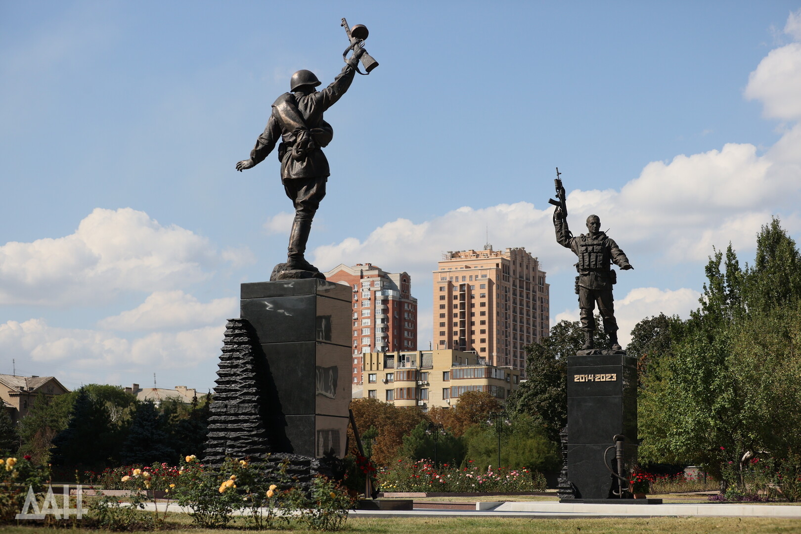 Две статуе стоје једна насупрот другој: једна приказује војника из периода 1941–1945, друга садашњег борца Донбаса 2014–2025. Око њих су уредне цветне леје ружа разних боја и нијанси. Овде их је веома много.