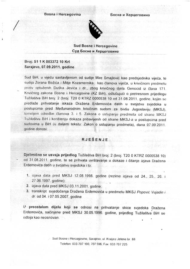 „У предметном поступку, браниоци оптужених су позвани да се писмено очитују о питањима која би поставили овом свједоку у унакрсном испитивању, која питања ће уз одобрење Вијећа, бити прослеђена у државу релокације у којој Дражен Ердемовић тренутно борави“.