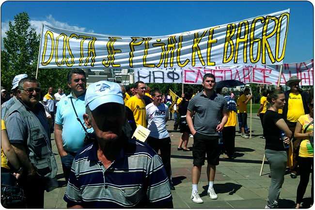 Види се транспарент „Џемепраши мафијаши“, те један траснпарент на енглеском „Last communist regime in balkans its time“.